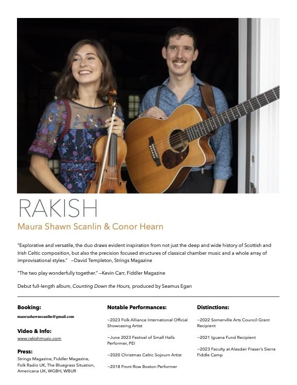 Rakish, embracing the unconventional connotation of their namesake, create and perform music with verve. Recent highlights of their travels include performances at the Library of Congress, Celtic Colours International Music Festival, Prince Edward Island’s Festival of Small Halls, the Corvallis Celtic Festival, and Official Showcases at Folk Alliance International. They have taught at esteemed fiddle camps across the country including Alasdair Fraser’s Sierra Fiddle Camp, Folk College, Katie McNally’s Boston States Fiddle Camp, and Hanneke Cassel’s Pure Dead Brilliant Fiddle Weekend.